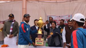 राष्ट्र ऋषि भारत रत्न नानाजी देशमुख जी की स्मृति में चित्रकूट स्पोर्ट्स क्लब कर्वी एवं दीनदयाल शोध संस्थान चित्रकूट द्वारा संयुक्त रूप से सुरेंद्र पाल ग्रामोदय विद्यालय खेल परिसर में आयोजित किए जा रहे नेशनल क्रिकेट टूर्नामेंट चित्रकूट चैलेंज कप 2024 के पुरुष वर्ग के फाइनल मैच में मध्य प्रदेश की जबलपुर ने राजस्थान की धौलपुर की टीम को 9 विकेट से पराजित कर कप पर कब्जा जमाया । धौलपुर की टीम ने टॉस जीत कर पहले बल्लेबाजी करते हुए अभी दिवाकर के 21, उत्कर्ष के 17, विवेक के 16 रनों के योगदान से निर्धारित 20 ओवर में 8 विकेट खोकर 102 रन बनाए ।जबलपुर के देवांश शुभम एवं आरव को दो-दो विकेट प्राप्त हुए। जवाब में जबलपुर में साहिल लोधी के ताबड़तोड़ नाबाद 46 रन एवं अमनप्रीत के नाबाद 28 रनों के योगदान से निर्धारित लक्ष्य को केवल 9.3 ओवर में एक विकेट खोकर प्राप्त कर लिया ।जबलपुर के साहिल लोधी को आज का मैन ऑफ द मैच चुना गया ।पुरस्कार वितरण एवं समापन समारोह की मुख्य अतिथि नगर विकास राज्य मंत्री मध्य प्रदेश शासन श्रीमती प्रतिमा बागरी , अध्यक्षता संगठन सचिव दीनदयाल शोध संस्थान श्री अभय महाजन, विशिष्ट अतिथि जिलाधिकारी चित्रकूट उत्तर प्रदेश श्री शिवशरण अप्पा जी एन ,विधायक चित्रकूट मध्य प्रदेश श्री सुरेंद्र सिंह गहरवार, पूर्व सांसद चित्रकूट श्री आरके सिंह पटेल, जिला अध्यक्ष भाजपा चित्रकूट श्री लवकुश चतुर्वेदी,कुलपति महात्मा गांधी चित्रकूट ग्रामोदय विश्वविद्यालय श्री भरत मिश्रा, जिला अध्यक्ष भाजपा महिला मोर्चा चित्रकूट श्रीमती दिव्या त्रिपाठी, महामंत्री भाजपा सतना श्रीमती राजेश्वरी द्विवेदी, पूर्व जिला अध्यक्ष भाजपा चित्रकूट श्री चंद्र प्रकाश खरे ,अध्यक्ष कोऑपरेटिव बैंक चित्रकूट श्री पंकज अग्रवाल, सभासद नगर पंचायत चित्रकूट श्रीमती रवि माला सिंह, वेस्ट भाजपा नेता शक्ति प्रताप सिंह तोमर, वरिष्ठ भाजपा नेता राव प्रबल श्रीवास्तव, राष्ट्रीय हॉकी कोच प्रेम शंकर शुक्ला आदि ने टूर्नामेंट आयोजन में सहयोग करने वालों एवं विजेता टीम के खिलाड़ियों को ट्राफी एवं नगद धनराशि देकर पुरस्कृत किया ।जबलपुर के साहिल लोधी को टूर्नामेंट का बेस्ट बैट्समैन, धौलपुर के वंश को बेस्ट बॉलर, धौलपुर के शिवम रंजन को बेस्ट फील्डर ,एवं जबलपुर के देवांश को चित्रकूट चैलेंज कप का मैन ऑफ द टूर्नामेंट चुना गया। टूर्नामेंट के बेस्ट अंपायर रोशन सेन, शिवकांत त्रिवेदी, वेद प्रकाश मिश्रा आशुतोष मिश्रा, बेस्ट कॉमेंटेटर सर्वेश निगम ,मनोज मिश्रा बेस्ट स्कोरर शशिभूषण सिंह रहे। टूर्नामेंट के सफल आयोजन में दीनदयाल शोध संस्थान के श्री अनिल जायसवाल, श्री अशोक पांडे, श्री कालिका प्रसाद श्रीवास्तव, श्री मदन तिवारी, श्री मनोज सैनी, श्री कमलेश प